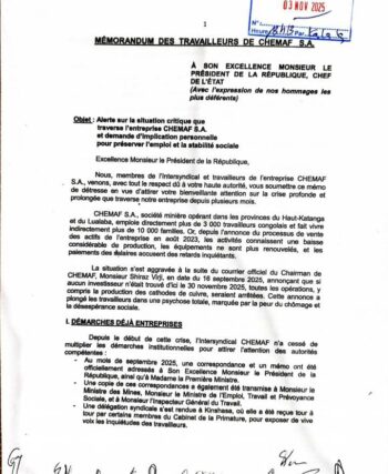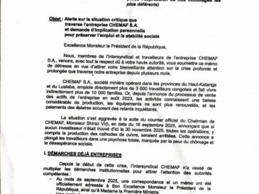 L’intersyndical de la société minière CHEMAF S.A. a adressé un mémorandum au Président de la …