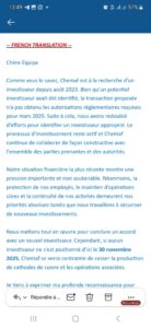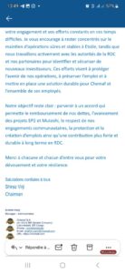 Vingt-quatre heures seulement après cette audience, soit le mardi 16 septembre 2025, alors que la délégation  poursuit encore ses démarches dans la capitale,  un courrier électronique adressé à l’ensemble du personnel par le Chairman de CHEMAF, Monsieur Shiraz Virji, a accentué l’inquiétude des travailleurs. Dans ce courrier électronique dont une copie a été transmise aux autorités compétentes par la délégation syndicale, Monsieur Virji informe que si aucun accord n’est conclu avec un nouvel investisseur d’ici le 30 novembre 2025, Chemaf sera contrainte de cesser la production de cathodes de cuivre et les opérations associées. Ce message accentue le désespoir des agents.