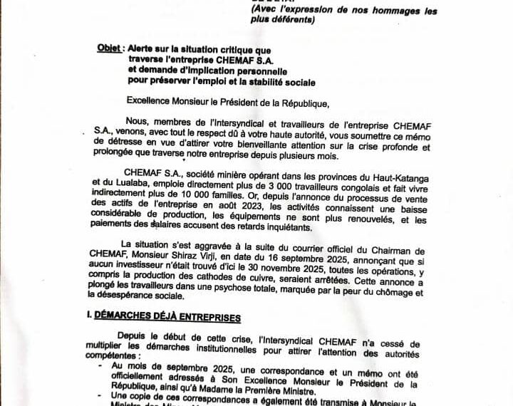 L’intersyndical de la société minière CHEMAF S.A. a adressé un mémorandum au Président de la République, Félix Tshisekedi, pour solliciter son implication personnelle dans la résolution de la crise que traverse l’entreprise. Ce document, déposé à la Présidence ce lundi, exprime l’inquiétude des plus de 3 000 travailleurs menacés de chômage à l’approche du 30 novembre 2025, date fixée par la direction comme butoir pour la fermeture des opérations si aucun investisseur n’est trouvé.